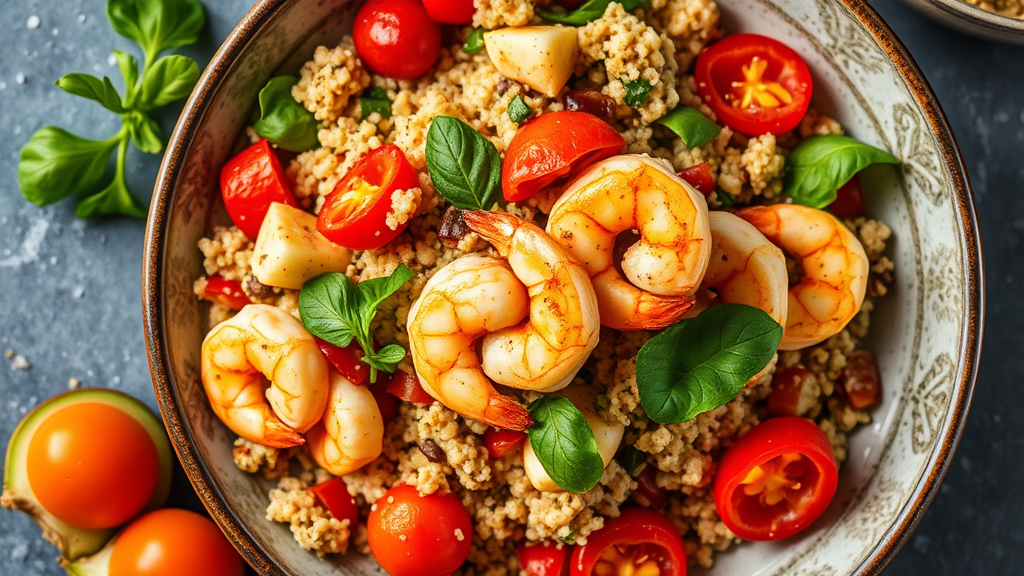This vibrant Mediterranean dish features seasoned lamb mince served on a bed of fluffy grains, …